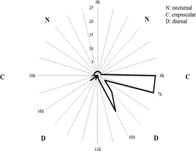 Scavenging activity showed a heterogeneous pattern for Andean Bears along 24-hour day period (K = 3.1498, P < 0.01). Bears showed preference for diurnal scavenging activities, especially during morning hours (6:00 h to 10:00 h) with 77.4 % of the events (Figure 1).