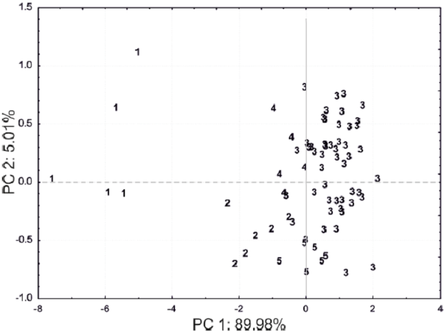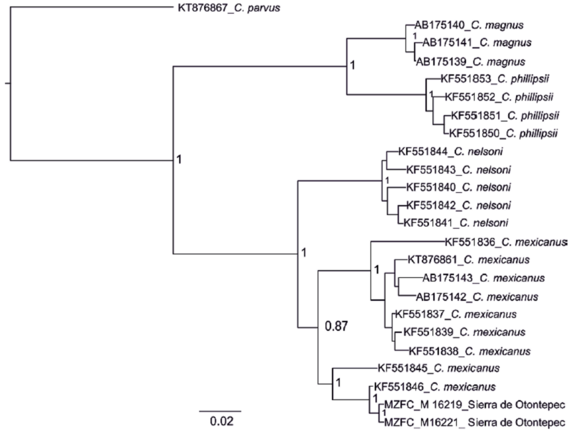 We obtained a total of six shrew specimens in the cloud forests from the Sierra de Otontepec; four were collected with pitfall traps and two with Sherman traps. The sample included three adult males (MZFC-M 16221, 16223-16224) and three adult females (MZFC-M 16219-16220, 16222), one of which was pregnant with five embryos (MZFC-M 16222). Other genera of mammals collected in this short-term survey were Handleyomys (rice rat), Sigmodon (cotton rat), and Marmosa (mouse opossum). The shrew specimens displayed previously reported external diagnostic characters of the Cryptotis mexicanus species group (Choate 1970; Guevara and Sánchez-Cordero 2018b). Principal components 1 and 2 explained 95% of the variation in the data (PC 1= 90 % and PC 2 = 5 %). The breadth of the palate across the second molars (M2B) and condylobasal length (CBL) contributed strongly to the first factor axis, providing a measure of overall cranial size. A plot of the two PCs showed that the specimens from Sierra de Otontepec tended to plot among the smaller species within the C. mexicanus species group (C. phillipsii and C. mexicanus) and overlapped partly with previously known specimens of C. mexicanus (Table 1; Figure 3). Bayesian Inference indicated that specimens from the Sierra de Otontepec are nested within C. mexicanus, which is supported by a high posterior probability (Figure 4). The rest of the relationships within the C. mexicanus species group resemble previous phylogenetic hypothesis (Guevara and Cervantes 2014; He et al. 2015).