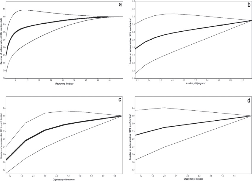 Species accumulation curves considering species richness of ectoparasites as a function of number of individual hosts of each species are shown in Figures 2 a-d. Although the number of host specimens of some species is low, the curve seems to stabilize for most of the species. The number of specimens of every ectoparasite species, as well as the values of mean abundance, prevalence and their distribution are shown in Table 2.