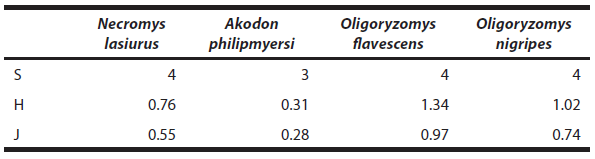 Ectoparasite component communities are compared in Tables 1 and 2. Oxymycterus rufus and Calomys sp. were not included, since O. rufus was not parasitized, and only one specimen of Calomys sp. was associated with a single flea (P. (P.) tripus). Akodon philipmyersi shows the lowest values of S, H and J (Table 1), with a remarkable dominance of A. ulysespardinasi (92 %; Table 2).