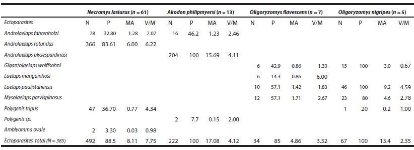 The collected ectoparasites were identified as: Acari, Mesostigmata, Laelapidae, Laelapinae: Androlaelaps fahrenholzi (Berlese; n = 94), A. rotundus (Fonseca; n = 366), A. ulysespardinasi Lareschi (n = 204), Gigantolaelaps wolffsohni Oudemansi (n = 21), Laelaps manguinhosi Fonseca (n = 6), L. paulistanensis Fonseca (n = 56), Mysolaelaps parvispinosus Fonseca (n = 35); Acari, Ixodida, Ixodidae: Amblyomma ovale Koch (n = 2, nymphs); Hexapoda, Siphonaptera, Rhopalopsyllidae, Rohopalopsyllinae: Polygenis (Polygenis) tripus (Jordan; n = 48), Polygenis sp. (n = 2).