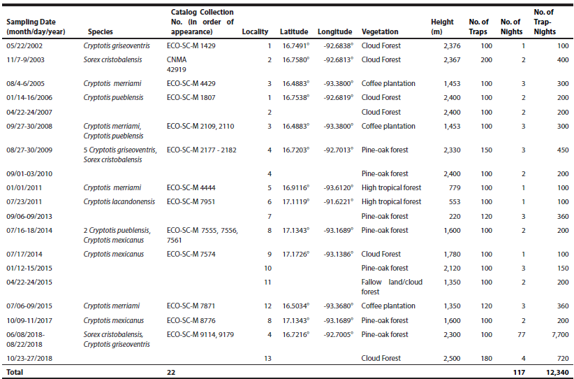 We collected information from the sampling of shrews of Chiapas at 13 different sites during 19 field trips from 2002 to 2018, each of different duration in days (Table 1). The sampling sites were located in mountain cloud forests, pine-oak forest in moist soil covered with leaf litter, medium and high tropical forest, fallow lands with patches of cloud forest, and coffee plantations. In each trip, we placed between 100 and 200 one-liter pitfall traps with no diversion fences.