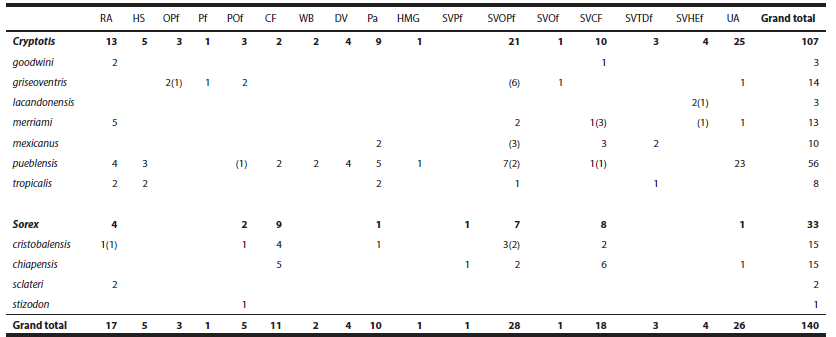 Shrews were recorded in secondary vegetation of pine-oak forest (C. griseoventris, C. mexicanus, C. pueblensis, S. cristobalensis); secondary vegetation of cloud forest (C. merriami, C. pueblensis); secondary vegetation of high evergreen forest (C. lacandonensis, C. merriami); ranfed agriculture (S. cristobalensis); oak-pine forest (C. griseoventris); and pine-oak forest (C. pueblensis;Table 2; Figure 1).