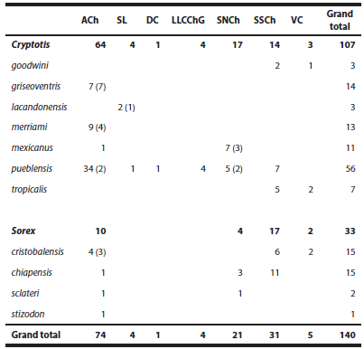 Of the 11 species of shrews distributed in Chiapas, five (45.4 %) are endemic to the state (Sorex stizodon, S. sclateri, S. cristobalensis, Cryptotis lacandonensis, and C. griseoventris), indicating that the State is home to 30.5% of the diversity of shrews known in Mexico (Ramírez-Pulido et al. 2014; Guevara et al. 2014a; Lorenzo et al. 2017; Burgin et al. 2018).