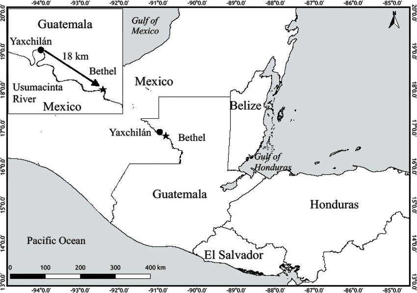 The area of Bethel is located at the southernmost limit of the Sierra del Lacandón National Park, which is also part of the Mayan Biosphere Reserve. The area was at that time covered mainly by humid tropical forest and seasonally flooded areas, but crops and cattle now dominate it. Nonetheless, pristine forest is still found in nearby wild protected areas both in México and in Guatemala (Méndez 1997). The original forest is classified as “high evergreen jungle” based on Miranda and Hernandez-X classification (Challenger and Soberón 2008), with different habitats locally known as “planicies” (tall forests on non-inundated plains), “bajos” (swamps with short forest), and “serranías” (tall forest on hills). Common species of trees in the area include: Brosimum alicastrum Sw. 1788, Brosimun costaricanum Liebm. 1851, Pouteria reticulata (Engl.) Eyma 1936, Alseis yucatanensis Standl. 1930, Coccoloba barbadensis Jacq. 1760, Blomia prisca (Standl.) Lundell 1961, Terminalia amazonia (J. F. Gmel.) Exell 1935, Coccoloba barbadensis Jacq. 1760, Simaruba amara Aubl. 1775, Calophyllum brasiliense Cambess. (1828) among others (Méndez 1997; Soto 2003).