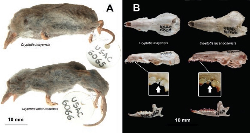Abstract: A field expedition in 1995 around the community of Bethel, in the shore of the Usumacinta River, Guatemala, produced the collecting of one fluid specimen of shrew that remained unidentified as a voucher at the mammal collection at San Carlos University in Guatemala City. Our target was to identify this specimen and make the morphological comparison with a series of species of shrews of northern Central America. We extracted, cleaned the skull, and conducted a morphological comparison of the Bethel specimen with five species (20 specimens) of shrews from Guatemala and Honduras, besides the comparison with the description of C. lacandonensis Guevara, León and Woodman 2014, from Chiapas, México. We also took 13 skull measurements and conducted a morphometric analysis. Morphology of the Bethel specimen fit well with the description of C. lacandonensis, especially U4 upper teeth aligned with unicuspid toothrow, with a presence of a medium gap between U3-P4 that makes U4 visible in labial and lateral view. Principal component and linear discriminant analysis also showed that Bethel specimen grouped well with C. lacandonensis. Bethel shrew specimen can be identified as C. lacandonensis, the second known locality for the species and the first record for Guatemala. The community of Bethel, in Guatemala, is located only 18 km south of the type locality at Yaxchilán archeological site, Chiapas, México. This is a poorly known species, which merits more research.