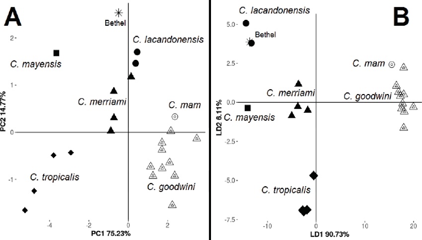 LDA results (Figure 3B) are in general in accordance with PCA, with highland species (C. goodwini and C. mam) at the right side of the graph, and lowland species well discriminated at the bottom (C. tropicalis), center left (C. merriami and C. mayensis), and top-left (C. lacandonensis and Bethel specimen). In general, LDA was better to discriminate species and groups than PCA, placing the Bethel specimen decidedly closer to C. lacandonensis than to C. mayensis. In LDA, the first function explains 90.73 % of the variance, with higher weights for HCP and TRD (see Table 2 for factor loadings), while the second function explains the 6.11 % of the variance with higher weights for M2B and HCP. LDA showed the conformation of well-defined groups, represented by the a priori species designations, and the classification function was 100 % in accordance with these designations.