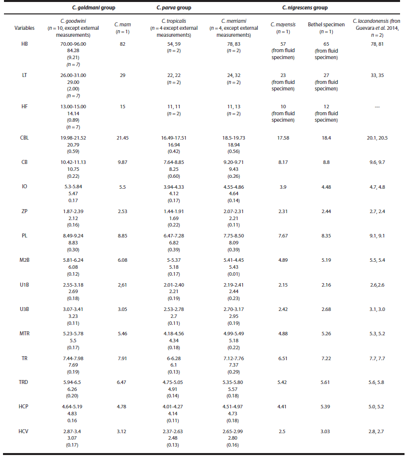 With the target of correctly identify this specimen, we recently extracted the skull of this fluid preserved specimen and then cleaned it with the help of a dermestid beetles’ culture, and then with a soft solution of ammoniac. For comparative reasons, we also examined 20 additional skulls within the C. nigrescens group (C. merriami and C. mayensis), C. goldmani group (C. mam and C. goodwini), and C. parva group (C. tropicalis). These specimens are deposited in two collections: Universidad de San Carlos de Guatemala (USAC) and Museo de Historia Natural, Ciudad Universitaria, Universidad Nacional Autónoma de Honduras (UNAH-CU); a complete list of specimens examined and their localities is given in the forward section. We were not able to check directly the holotype and paratype of C. lacandonensis, as it is desired in this comparisons, but since it was one of the probable names for the Bethel specimen, due to the proximity to the type locality, we included in the morphometric analysis the measurements of the holotype and paratype reported in Guevara et al. (2014).