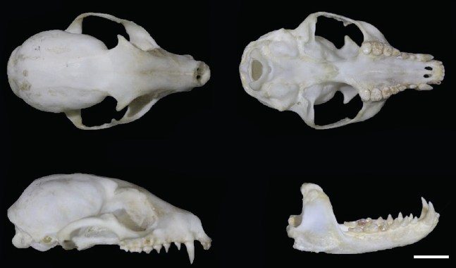 Externally, the specimen shows a uniform coloration between the body and the tail, with no evidence of a dark dorsal strip (Figure 1). The nose is dark brown. The external measures are similar to those observed in other species of the genus (Table 1); however, total length and tail length (860.0 and 460.0 mm respectively) exceed the values seen in B. neblina (upper limits: 820.0 and 424.0 mm, respectively). The skull measurements are similar to those recorded for females of other species in the genus found in Colombia (Table 1). However, condylobasal length (82.0 mm) and cranial vault width (28.2 mm) exceed the upper limits observed in B. alleni and B. neblina (80.5 and 28.1 mm for B. alleni, and 77.9 and 27.8 mm for B. neblina).