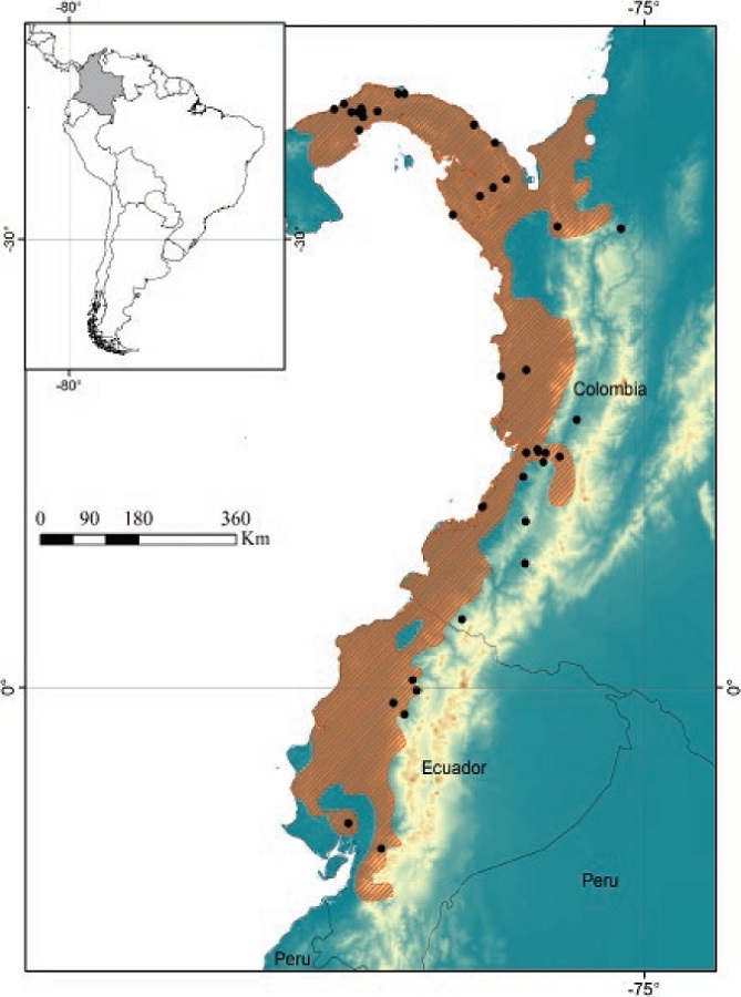 HRC thanks the Facultad de Ciencias Exactas y Naturales, Universidad de Caldas for the support provided to visit the Museo de Historia Natural de la Universidad del Cauca (MHNUC). Hugo Mantilla-Meluk and an anonymous reviewer made valuable contributions to earlier versions of this manuscript. Thanks also to Pilar Rivas Pava (MHNUC), and to Bruce D. Patterson and The Science and Scholarship Committee of the Field Museum of Natural History, Chicago, for allowing the review of specimens under their care. María Elena Sánchez-Salazar translated the manuscript into English.