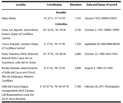 This is the second validated record of the species in Western Cordillera and the first near a protected area in this Cordillera (Farallones National Natural Park). The locality is close to the northernmost record at Alto de Galápagos, on the limits between the departments of Chocó and Valle del Cauca (Alberico 1994). With this new locality, the approximated Extent of Occurrence (EOO) is near to 40,146 km2, of which 37,238 belong to Colombia. The Area of Occupancy (AOO) is 24 km2 (based on a 2 km cell-width; Figure 2).