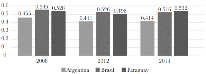 Los datos de esta extrema desigualdad social en Argentina, Brasil y Paraguay pueden ser verificados con el Coeficiente de Gini, como instrumento usado para medir el grado de concentración de la renta, señalando la diferencia entre los rendimientos de los más pobres y de los más ricos. En un numeral, varía de 0 a 1, siendo que 0 (cero) representa la situación de total igualdad; es decir, todos tienen la misma renta, y el valor 1 (uno) significa completa desigualdad de renta; es decir, una sola persona detiene toda la renta del lugar.