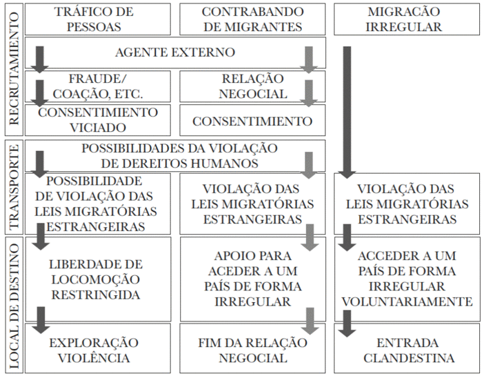 El tráfico de personas no debe confundirse con el contrabando de migrantes o con la migración irregular, de acuerdo con el Diagnóstico sobre Tráfico de Personas en las Áreas de Frontera del Ministerio de Justicia brasileño; aquél se caracteriza por la adquisición para obtener, directa o indirectamente, beneficio financiero u otro material, de la entrada ilegal de una persona en un Estado parte del cual la persona no es ciudadana o residente permanente. La migración irregular, por su parte, consiste en que una persona ingrese en un país del cual ella no es ciudadana, sin autorización 5 o permanecer después del vencimiento del visado o permiso de residencia cuando no tiene estatuto legal.24