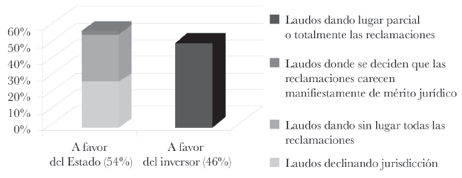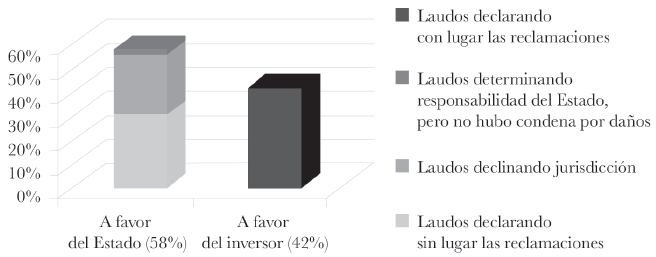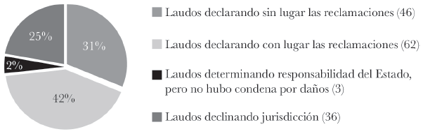 En la gráfica 1 se muestran los laudos emitidos por los tribunales arbitrales CIADI, los cuales son objeto del presente estudio. Se presentan los laudos favorables al Estado, en los cuales se declaran sin lugar las reclamaciones (46 laudos); los laudos que declinan la jurisdicción (36 laudos), y los laudos favorables a los inversores, en los cuales se declaran con lugar las reclamaciones (62 laudos). Además, existen algunos laudos en los cuales se determinó la responsabilidad del Estado, pero no hubo condenas por daños (3 laudos).