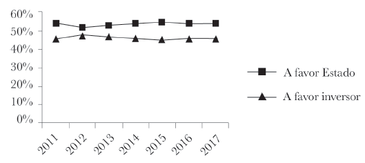 Es posible pensar que estos resultados puedan variar con el tiempo. Sin embargo, si se revisan las estadísticas anuales del CIADI, publicadas en sus correspondientes informes desde el 2011 hasta el 2018,38 se encuentra que hay poca variación porcentual en los “resultados ganadores”, tal como se puede apreciar en el Gráfico 5. Por lo tanto, se puede afirmar que, desde el 2011, los Estados demandados, que en su mayoría son países en desarrollo, han ganado más casos que los inversores demandantes.