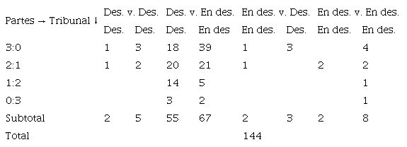 Se puede concluir en esta sección que existe una baja correlación entre la integración de los tribunales y los “resultados ganadores” en las controversias entre los países desarrollados y los países en desarrollo. Asimismo, existe una baja correlación entre la integración de los tribunales y los resultados ganadores en las controversias entre los inversores demandantes y Estados demandados.