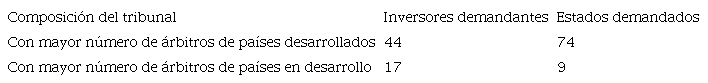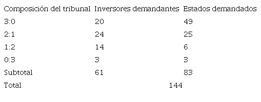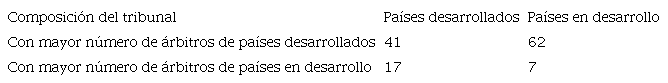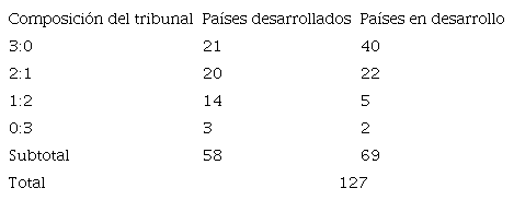 En el cuadro 1 se muestra la composición de los tribunales y las partes en los 144 casos considerados en este apartado. Se puede apreciar que los tribunales con mayoría de árbitros de países desarrollados son más numerosos que los tribunales con mayoría de árbitros de países en desarrollo. Además, los inversores de países desarrollados han llevado más casos que los inversores de países en desarrollo. Puesto que los inversores de países desarrollados son generalmente compañías transnacionales, se podría esperar que los tribunales con mayoría de árbitros de países desarrollados tiendan a favorecer a dichos inversores y deberían ganar en la mayoría de los casos.