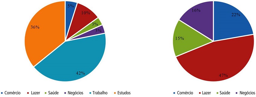 Se o local de emprego constitui uma variável importante para a análise das desigualdades de mobilidade, diversos estudos (Caubel, 2006; Delage, 2012) sugerem que a observação da mobilidade destinada a outras atividades, como o comércio, serviços, lazer, pode revelar igualmente situações de intensa desigualdade. Além disso, os estudos que se restringem à investigação dos deslocamentos domicílio-trabalho excluem uma parcela significativa da população (jovens, desempregados, aposentados). Nesse sentido, procura-se focar, no presente estudo, em quatro tipos de atividades distintas definidas por Caubel (2006) como “a interpretação dos motivos de deslocamento mais recorrentes dos indivíduos – estrutura a minima – independentemente de grupo social, nível de vida ou posição social”2: comércio (compras), negócios (banco, loteria, etc.), lazer3 (turismo, recreação, visitas, atividades religiosas) e saúde (médico, dentista, exame laboratorial).