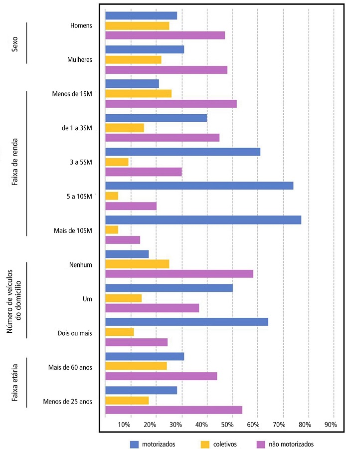 Constata-se, também, que os deslocamentos não motorizados constituem aproximadamente 50% da mobilidade dos indivíduos que ganham menos de 3SM. Essas camadas recorrem uniformemente ao transporte público (26% dos deslocamentos dos indivíduos ganhando menos de 1SM). Por outro lado, a mobilidade das classes de alta renda (ganhando mais de 10SM) é fortemente associada ao uso do automóvel, que representa um total de 77% dos deslocamentos.