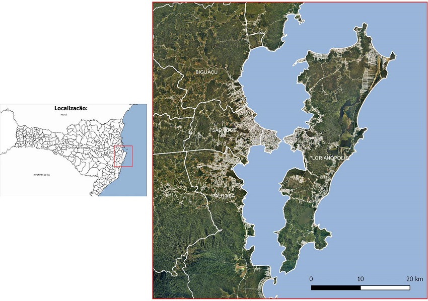 A ocupação urbana da RMF concentra-se na chamada área conurbada, abrangendo os municípios de Florianópolis, São José, Palhoça e Biguaçu, nos quais se destacam fortes relações de dependência socioeconômica e de deslocamentos pendulares cotidianos da população. Geograficamente, há o diferencial de quase a totalidade do município de maior importância situar-se na Ilha de Santa Catarina, com apenas uma ligação rodoviária de duas pontes conectando a parte continental à insular. Há também a presença de vastas áreas de preservação permanente (APP), principalmente na porção insular, como morros, lagoas, rios, mangues e dunas, condicionando e restringindo a ocupação urbana na ilha, como se observa na Figura 1.
