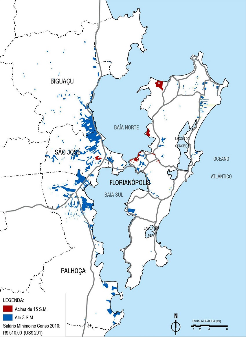 Além disso, as camadas sociais de maior renda foram concentrando-se na ilha, na península central, em especial na parte norte da península. Durante o século XX, parte do setor hegemônico expandiu suas áreas de lazer e residenciais também para a orla da metade norte da ilha, direcionando, para essas áreas, a maior parte dos investimentos públicos que vêm sendo implementados no município desde a década de 1960. Esse processo contínuo de concentração de investimentos públicos, de legislações e de ações privilegiadas, determinou a atual segregação socioespacial apresentada por Florianópolis e a sua área conurbada.