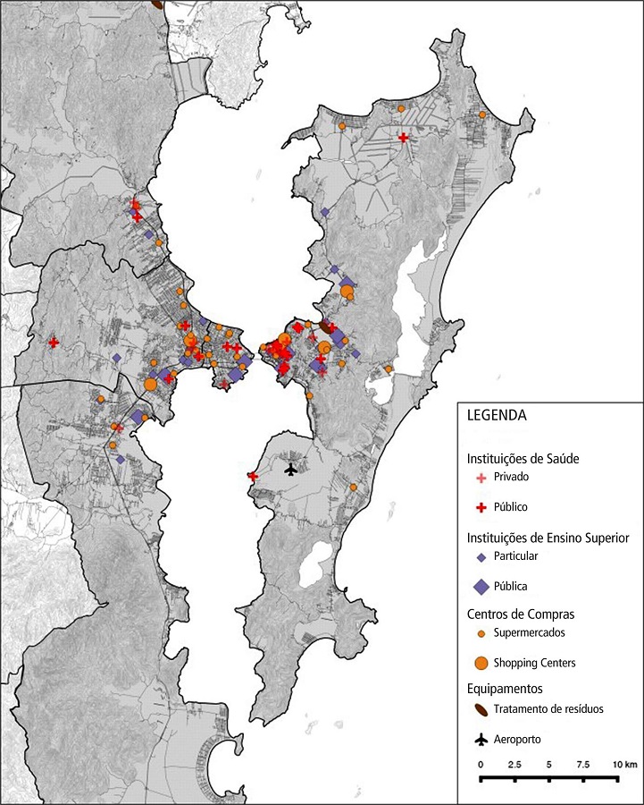 Atualmente, há também uma concentração dos serviços, empregos e instituições na área central do município de Florianópolis, mais especificamente em sua porção insular, mas com oferta significativa no setor continental, principalmente a leste da rodovia BR-101, evidente através da Figura 3. Conforme Villaça (2001), a disponibilidade e o acesso aos serviços públicos determinam o preço dos terrenos que, por sua vez, influencia a conhecida distribuição espacial não só das camadas sociais, mas também de seu comércio, serviços e indústrias. Através dos preços dos terrenos e, consequentemente, dos imóveis, o resultante é a distribuição das vantagens e desvantagens da cidade, de suas qualidades e de seus defeitos, todos estes socialmente produzidos, mas privadamente apropriados através da localização pela qual se pode pagar.