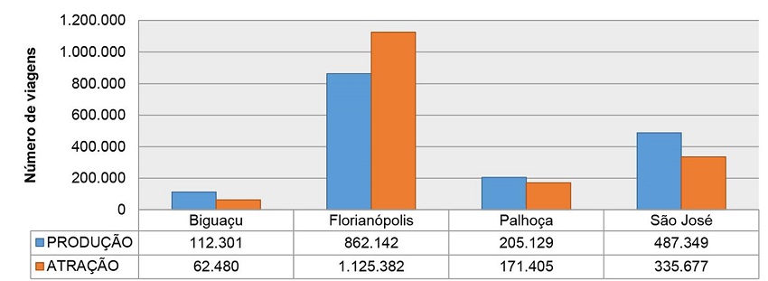 Na Figura 4, isso fica ainda mais visível. Através dos dados da pesquisa origem-destino do Plano de Mobilidade Urbana Sustentável da Grande Florianópolis (Plamus), observa-se que Florianópolis é o único que atrai mais viagens4 do que produz. Dentre os outros municípios, Palhoça apresenta-se como o mais “equilibrado” nesse sentido, e São José é o município que mais pode ser identificado como “dormitório”, uma vez que produz muito mais viagens do que atrai, e esse excedente se destina, principalmente, a Florianópolis. Reiterando que há apenas um ponto de ligação rodoviária, pode-se mensurar a gravidade da situação.