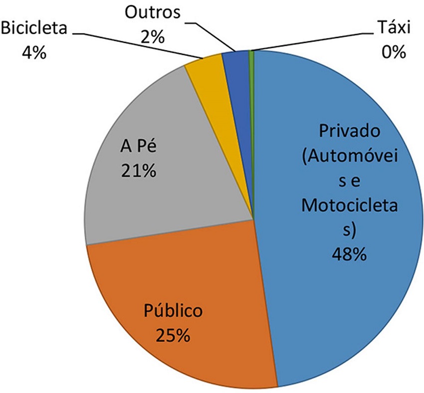 O transporte não motorizado (bicicletas e pedestres), por sua vez, aparece com participação reduzida na divisão modal, possivelmente em decorrência das condições precárias das calçadas, da insegurança em se utilizar a bicicleta como meio de transporte, da insuficiente e descontínua rede de ciclovias e, principalmente, pelo fato de que a grande maioria da população residir afastada dos locais de emprego ou de educação, dificultando esse modo de deslocamento.