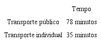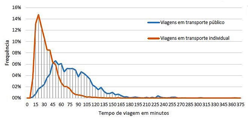 Ainda amparados pelos dados da pesquisa origem-destino, Quadro 2 apresenta o tempo médio de viagens, em que o transporte público apresenta uma média de 78 minutos, considerada extremamente alta, e mais que o dobro do tempo médio de viagem dos transportes privados, de 35 minutos. A Figura 6 mostra o histograma dos tempos de viagem, evidenciando que enquanto a maioria das viagens realizadas por transporte individual concentram-se em um período mais curto entre 15 e 30 minutos, com um pico na casa dos 20 minutos, no transporte público observa-se que há uma frequência de viagens praticamente similar entre viagens entre 45 e 105 minutos. Um agravante é que o transporte coletivo é exclusivamente realizado através de ônibus, que disputam espaço com os automóveis nas vias, não contando com nenhum tipo de infraestrutura exclusiva.