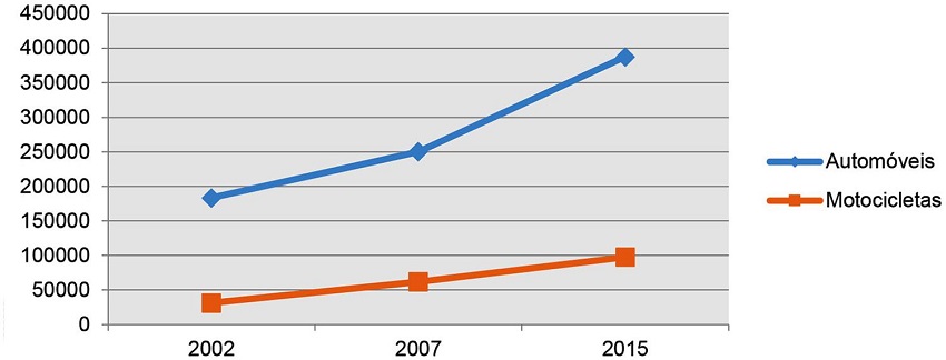 Essa dinâmica se reflete na elevada posse de veículos automotores. Através da Figura 7 se vê o aumento da frota nos quatro municípios da área conurbada de Florianópolis. Entre os anos de 2002 e 2015, houve crescimento de 111,57% na frota de automóveis e 213,49 na de motocicletas, ao mesmo tempo que a população dos municípios, no mesmo período, cresceu 27,89%.5 O aumento do poder de compra dos brasileiros, juntamente à facilidade da obtenção de crédito e às políticas de subsídios para a compra de automóveis, aliado ao serviço precário e caro do transporte coletivo e à crescente dispersão das cidades, contribuíram para o aumento da frota na última década.