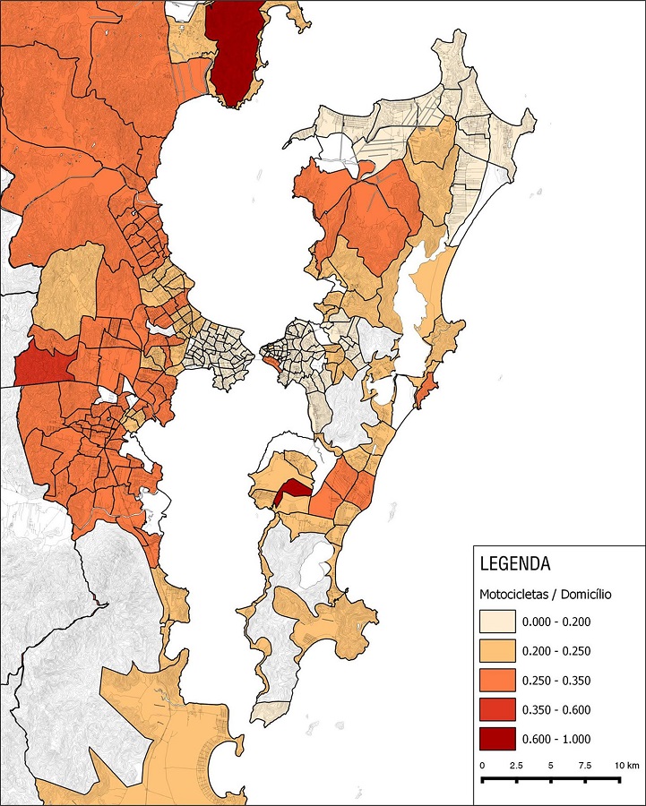 Nas Figuras 8 e 9, observa-se a distribuição da frota de automóveis e motocicletas por domicílios, respectivamente. Os dados indicam que, enquanto o maior índice de posse de automóveis coincide com as regiões mais bem localizadas e nas quais se concentra a população de maiores rendimentos, os maiores índices de posse de motocicletas situam-se nas áreas afastadas dos centros urbanos, que também contam com piores atendimentos das linhas de ônibus.