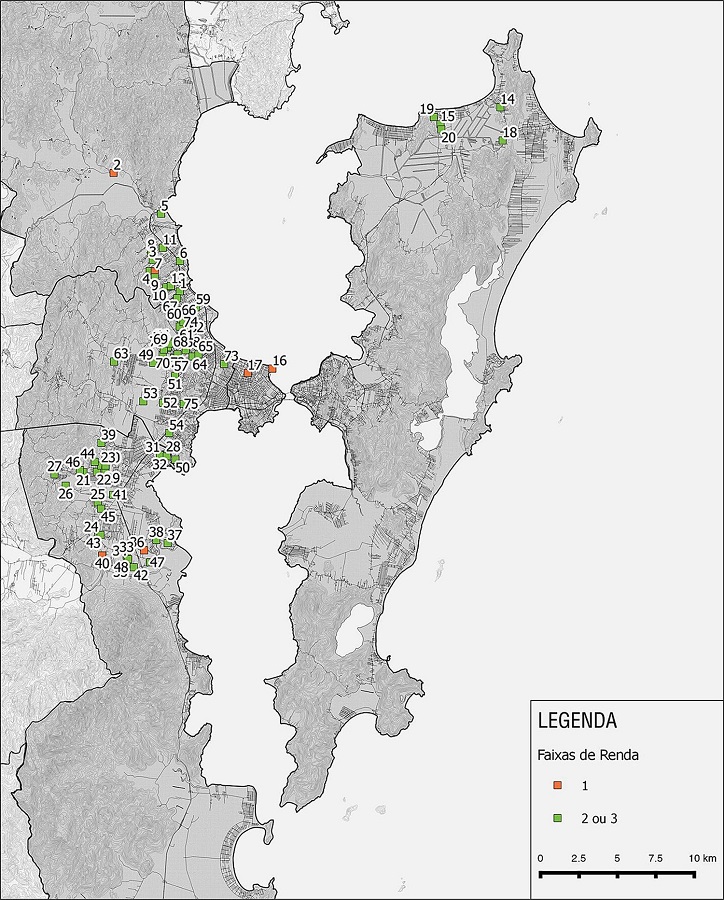 A disparidade entre regiões que, historicamente, receberam investimentos estatais e outras que foram relegadas é evidenciada na Figura 2, que mostra os extremos de renda segundo o Censo de 2010. O que se observa é que a grande maioria dos assentamentos urbanos de renda mais baixa se localiza na periferia da área conurbada, a oeste da BR-101. Em um estudo sobre as habitações informais na área conurbada, a pesquisa Infosolo, no ano de 2009, identificou 171 áreas de informalidade e pobreza, muitas delas no próprio município de Florianópolis. Isso revelou uma face pouco conhecida sobre a região, uma vez que grande parte das áreas informais se encontra invisível aos olhos da população, não sendo vistas das grandes vias de circulação (Sugai et al., 2005; Sugai, 2009).