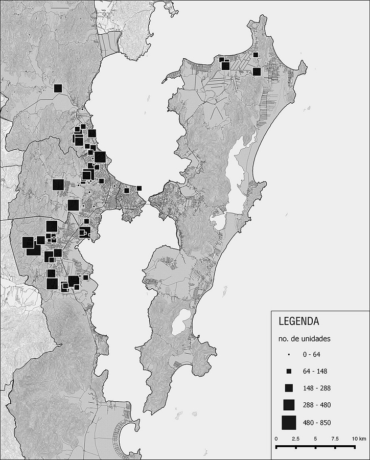 Os empreendimentos do PMCMV, portanto, têm sido construídos nas áreas mais periféricas, sobretudo nos municípios de Palhoça e São José, amplificando o processo de periferização e tornando-se agente imprescindível dessa dispersão urbana, uma vez que contam com o aval e o apoio do poder público, sobretudo através da dotação de infraestruturas. Não obstante, a dispersão urbana coexiste com uma quantidade elevada de vazios urbanizados, glebas com infraestrutura adequada e consolidada, mas que são subutilizadas ou mantidas pelo capital imobiliário para fins especulativos. Isto dificulta o acesso dos moradores a comércio e serviços cotidianos. Essa condição se aplica também aos serviços básicos de saúde, educação, lazer. A população residente é obrigada a deslocar-se para outras localidades, impactando nos sistemas de transporte e diminuindo a qualidade de vida. Vê-se também, através da Figura 10, que os empreendimentos com mais unidades habitacionais são, justamente, os mais afastados, conformando vizinhanças inteiras de conjuntos habitacionais murados, com pouquíssimos serviços e comércios de apoio.