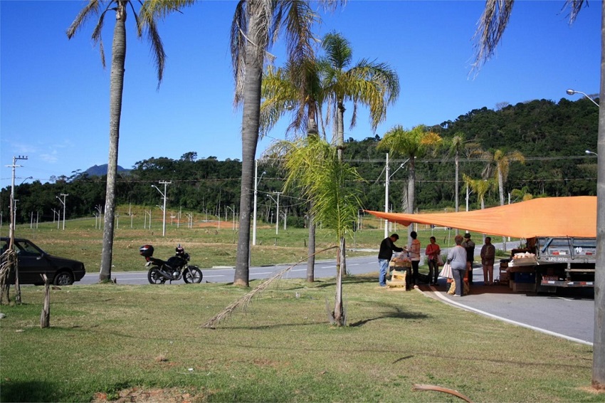 Ilustrando a carência de pequenos comércios lindeiros, verificou-se, próximo à entrada de um dos empreendimentos no município de Palhoça, em um sábado pela manhã, um caminhão de feira vendendo diversas frutas e hortaliças (Figura 13), além de um automóvel em que eram vendidos produtos de limpeza, conformando um mercado informal que é uma opção improvisada para mitigar o isolamento do condomínio.