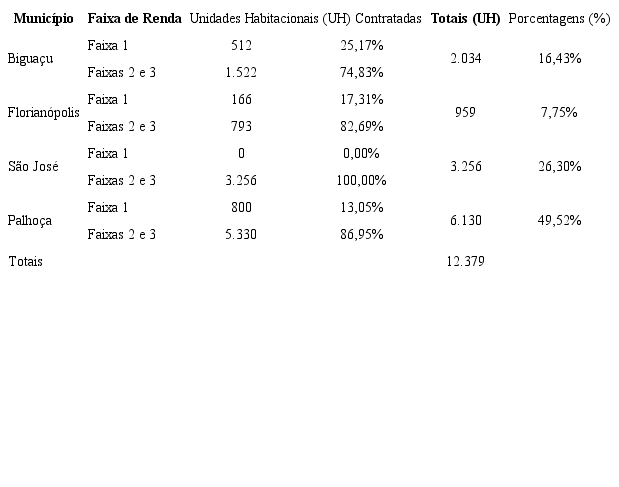 Constata-se, ainda, que há uma preponderância nos empreendimentos da faixa de renda 2 e 3 (Ver Quadro 3), que respondem por 89% do total na área conurbada, confirmando a tendência em todo o território brasileiro, uma vez que possibilita maior lucratividade por parte dos empreendedores. É importante salientar o percentual extremamente baixo de empreendimentos para a faixa de renda 1, mais subsidiada, que representa apenas 12% das unidades habitacionais contratadas no período e que evidencia a dificuldade de enfrentamento real ao déficit habitacional na área conurbada de Florianópolis.
