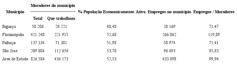 A relação de pendularidade diária já citada pode ser comprovada por meio dos dados dispostos na Tabela 1. Nota-se que o município de Florianópolis é o único com mais empregos do que população economicamente ativa, o que significa que demanda um contingente de trabalhadores vindo dos municípios vizinhos preenchendo diariamente seus postos de trabalho. Segundo o Censo 2010 (IBGE, 2010), as atividades dos trabalhadores de Florianópolis vindos de outros municípios são principalmente: os serviços domésticos (28,83% das vagas de Florianópolis); a construção civil (23,07% das vagas) e os serviços industriais de utilidade pública (Siup) e de administração pública (23,06% das vagas). Isso mostra que a mão de obra atraída para o município de Florianópolis é, principalmente, para trabalhos que exigem menores qualificações, com vencimentos mais baixos.