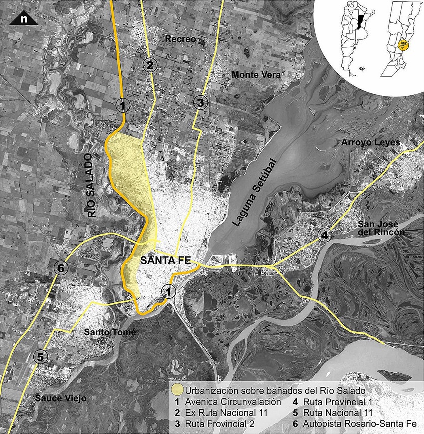 La ciudad de Santa Fe, capital de la provincia homónima ubicada en la región Centro-Este de la República Argentina, representa el centro administrativo, funcional y de servicios con mayor jerarquía del continuum urbano denominado Gran Santa Fe. Con una población total de 490.171 habitantes, según Censo Nacional de Población, Hogares y Viviendas 2010, su crecimiento se originó desde el extremo sureste, en vinculación con el trazado fundacional y el curso de la Laguna Setúbal, hacia el Norte y el Oeste. En relación a esta última direccionalidad, la mancha urbana avanzó a lo largo del siglo XX sobre terrenos anegadizos pertenecientes a los bañados del Río Salado, generando una creciente vulnerabilidad social y espacial profundizada en las últimas décadas. Por otro lado, un patrón territorial de crecimiento responde a la prolongación de vías circulatorias en distintas direcciones, incluyendo en su extensión a las localidades vecinas de Monte Vera y Recreo al Norte; Santo Tomé y Sauce Viejo al Suroeste; San José del Rincón y Arroyo Leyes al Este (Figura 1).