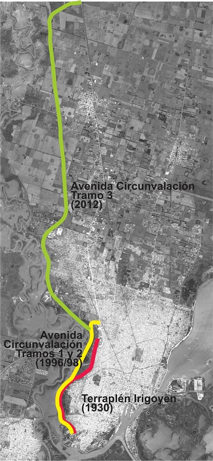 El crecimiento de la mancha urbana hacia el Oeste de la ciudad de Santa Fe presenta hoy un límite bien definido materializado en la Avenida Circunvalación, un límite entendido aquí más allá de su conformación física-espacial y, por consiguiente, en tanto límite al intercambio socio-espacial. El trazado de esta vía de alcance nacional se originó en las primeras obras de defensa construidas a la vera del Río Salado. Hacia finales de la década de 1930, un doble proceso impulsó el crecimiento urbano en dirección Oeste y la consecuente ocupación de terrenos anegadizos; por un lado, el incremento del valor inmobiliario que recibieron los suelos próximos al puerto de ultramar, por otro, el crecimiento demográfico experimentado en la ciudad a partir de la llegada de migrantes rurales. La rentabilidad disminuía hacia el Oeste y, rápidamente, el crecimiento se extendió más allá de las vías ferroviarias sobre los bañados del Río Salado. La generación de una situación vulnerable y su posterior agravamiento derivó en la implementación de políticas urbanas tendientes a controlar el curso fluvial, materializadas en la construcción del terraplén Irigoyen. No obstante, esta obra de singular importancia ingenieril para la ciudad fue concebida en términos estrictamente técnicos, alejada de los planteamientos higienistas y de embellecimiento que por entonces surgieron en la ciudad. En este sentido, el proceso de ocupación de los bañados del Oeste se mantuvo escindido de la planificación e ideación urbana, profundizando un estado de vulnerabilidad ante la escasez de servicios urbanos, nulas restricciones de ocupación, y la reproducción de condiciones marginales. Décadas más tarde, su carácter meramente protector se convierte además en contenedor de un tránsito incompatible con la dinámica urbana, a partir de la construcción de la Avenida Circunvalación Oeste. Construidos sus dos primeros tramos entre los años 1996 y 1998 y concluida en 2012 luego de la catástrofe hídrica del año 2003,1 esta obra vial vino a resolver una demanda funcional a nivel local y, fundamentalmente, regional y nacional, en tanto nuevo eje de circulación de la Ruta Nacional 11 (Figura 2).