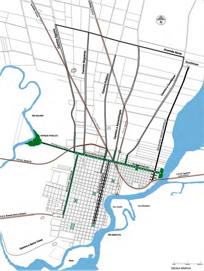 Por iniciativa del concejal Julio Cabal, en diciembre de 1927 se presentó ante el Concejo Municipal el primer plan urbano para la ciudad de Santa Fe. El denominado “Plan de Urbanización” consistió en un conjunto de iniciativas dirigidas a regular el desarrollo urbano en términos estrictamente funcionales y estéticos. A partir de criterios distributivos y de zonificación, un grupo de propuestas abogaban por la localización de barrios tipo jardín y de nuevos espacios verdes sobre el margen de la Laguna Setúbal, mientras que la previsión del área industrial, los grandes contenedores, los cuarteles y barrios obreros fueron planteados hacia el margen Oeste próximo al Salado, sentando las bases de un ideal fuertemente segregado espacial y socialmente (Figura 5). Esta voluntad por diferenciar zonas urbanas, se manifiesta en la descripción del trazado de la Avenida Circunvalación: