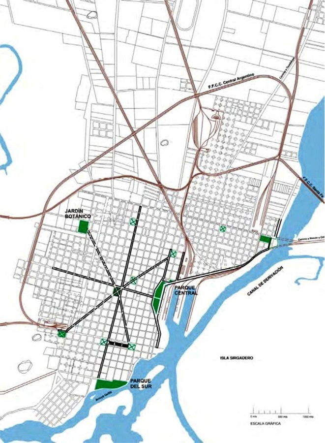 Entre las preocupaciones del plan, los problemas urbanos causados por el entramado de las vías ferroviarias ocupan un lugar central en la propuesta. Con el objetivo de liberar la planta urbana de esa “intricada ramazón”, de esa “tela de araña perniciosa y fatal”, se plantea el emplazamiento de la estación central en la zona Oeste sobre los terrenos ganados a los bañados del Río Salado. La connotación negativa que recibe nuevamente el borde Oeste queda manifestada en la voluntad por convertir en bellas avenidas las zonas que hasta el momento ocupaban las líneas férreas, y en modernos parques y jardines los lugares ocupados por las estaciones; al tiempo que el espacio destinado a la nueva localización se mantiene alejada de los preceptos defendidos en el plan en cuanto a la higiene, el confort, la belleza y la seguridad social: