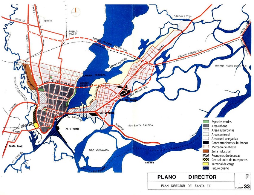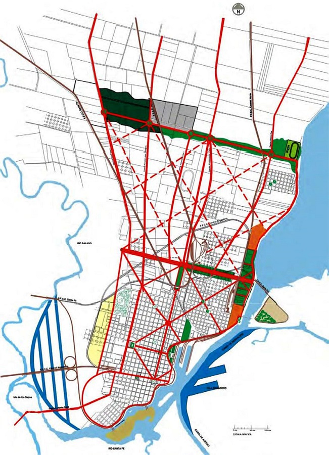Si bien el plan focaliza en los problemas vinculados a la circulación y propone un sistema de vías diagonales que permitirían el acceso a toda la planta urbana, la propuesta de una avenida costanera de carácter paisajístico sobre el margen Este, no es siquiera planteada a lo largo del margen Oeste, considerando que hacia la fecha una buena parte del crecimiento urbano se consolidaba en esa dirección. A pesar de quedar sin efecto, la idea manifestada en el plan de trasladar el área industrial, de servicios y de almacenamiento, nutrió no sólo el ideario de futuros documentos urbanísticos. La construcción material y simbólica del borde Oeste estuvo ligada a sucesivas connotaciones negativas, a partir de la instalación de diferentes equipamientos urbanos considerados indeseables e insalubres para el desarrollo de la vida urbana, a saber: matadero, lazareto y asilo para inmigrantes, cementerio, cárcel, reformatorio de menores, hospital psiquiátrico y hospitales.
