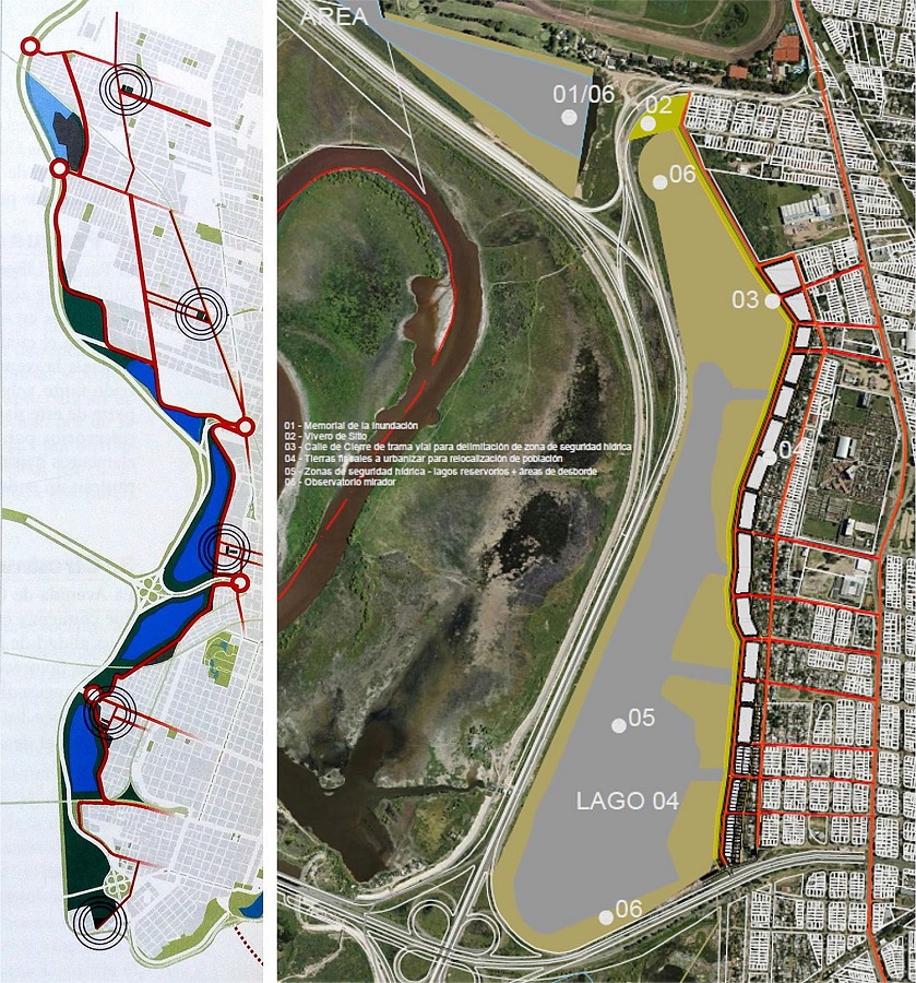El último plan con el que cuenta la ciudad de Santa Fe corresponde al Plan Urbano del año 2009, del cual deriva el Reglamento de Ordenamiento Urbano (ROU) vigente a la actualidad. Al igual que en los planes de 1980 y 2007, existe una lectura y diagnostico de las aéreas vulnerables y marginales en continuo crecimiento sobre el borde Oeste. Sin embargo, la problemática vuelve a reducirse a criterios de estricta zonificación y con débiles planteos de integración, intercambio y revalorización de la ribera Oeste. Entre las áreas de planificación especificadas en el ROU, los principales distritos del borde Oeste se zonifican de acuerdo a los siguientes usos: I (Industrial); R3 (Residencial de baja densidad en proceso de integración); R5 (Residencial de baja densidad en área en consolidación); ZSH (Zona de Seguridad Hídrica); RUA (Rural Anegadizo). No obstante ello, cabe destacar una visión de apertura y búsqueda de reconversión del borde Oeste a partir del proyecto Reserva Natural Urbana y Gestión de Riesgos Climáticos, aprobado según Ordenanza Municipal 12179 (Figura 8). El mismo consiste en la transformación de los reservorios del sistema de drenaje urbano en un espacio verde de uso público y atractivo paisajístico. Este planteamiento se enmarca en una política de gestión de riesgo desarrollada desde el año 2008 y en la implementación de la idea de ciudad resiliente.