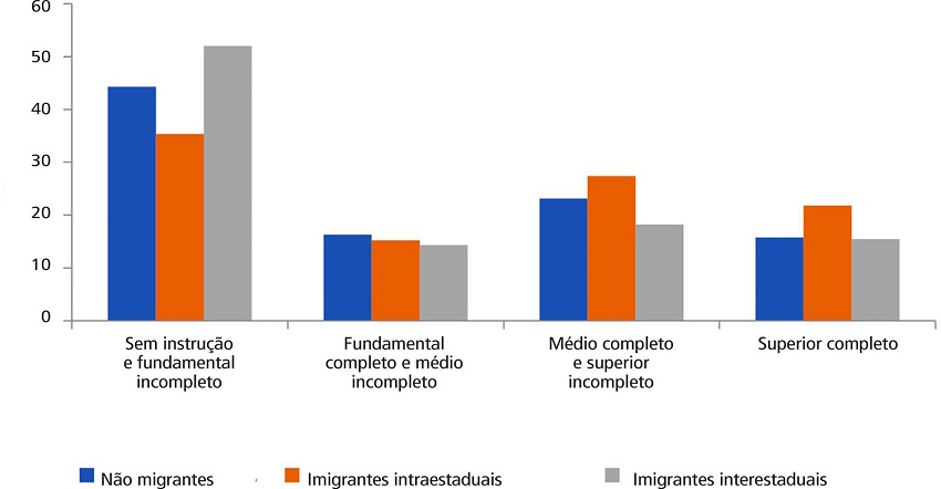 Pode-se perceber que os indivíduos que vieram de outras unidades da federação apresentam níveis de instrução inferiores. Entre eles, mais da metade foi classificada como “sem instrução ou com nível fundamental incompleto”. Esses indivíduos também possuem os menores percentuais de população com nível superior completo. Além disso, os imigrantes com origem em municípios do estado de São Paulo apresentam maior escolaridade, inclusive quando comparados com os não migrantes.