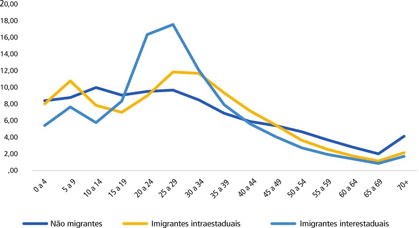 A distribuição etária dos não migrantes não indica grande influência da migração, aproximando-se de uma distribuição etária típica das regiões brasileiras que se encontram em fase adiantada do processo de transição demográfica. A composição etária dos imigrantes, por sua vez, atesta alta seletividade etária, dado que há elevada concentração em idades específicas. Ademais, há uma diferença marcante entre os que vieram de municípios do próprio estado de São Paulo (imigrantes intraestaduais) em relação aos provenientes de outras UFs (imigrantes interestaduais). Entre os imigrantes intraestaduais, há uma concentração de indivíduos com 25 a 39 anos de idade, acompanhada de crianças com 5 e 9 anos de idade. Também os migrantes que vieram de outras Unidades da Federação se concentravam-se principalmente entre os 20 e 34 anos de idade.