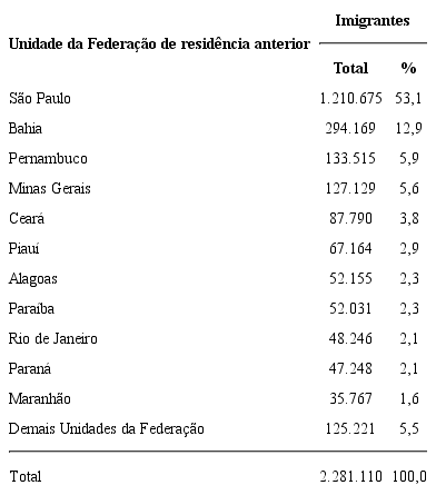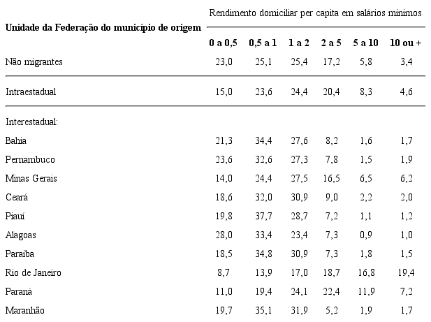 Pode-se perceber que os imigrantes com maiores rendimentos são os provenientes do Rio de Janeiro, cujo percentual dos que migraram sós é mais elevado. Piauí e Alagoas, com percentuais relativamente mais elevados de migração em grupo, possuem os imigrantes em pior situação econômica.