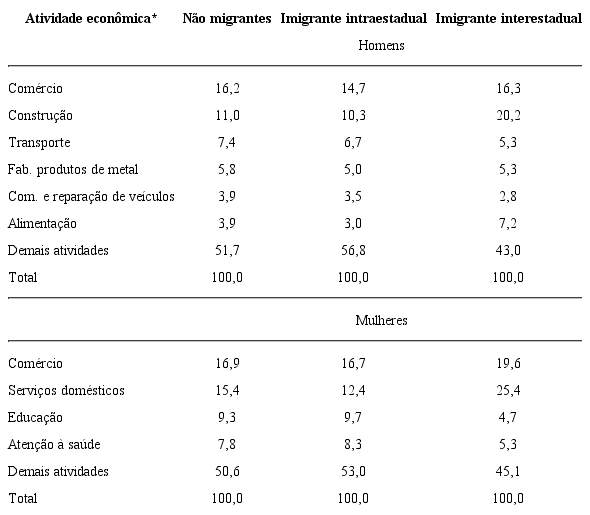 A inserção dos imigrantes no mercado de trabalho, segundo os principais setores de atividade em que trabalhavam, é apresentada na Tabela 2, comparativamente aos não migrantes, separados homens e mulheres. As principais atividades econômicas dos imigrantes, tanto para homens como para mulheres, eram as mesmas dos não migrantes, embora houvesse variação da importância de cada divisão de atividade segundo condição migratória. No caso dos homens, o comércio empregava um percentual semelhante para todas as categorias analisadas, mas empregava ligeiramente menos imigrantes intraestaduais. Já a construção empregava quase o dobro de imigrantes interestaduais, em termos percentuais, do que de não migrantes e de imigrantes intraestaduais. No caso das mulheres, o comércio foi o que mais empregou, tanto as não migrantes como as imigrantes intraestaduais, enquanto o serviço doméstico foi a principal atividade das imigrantes interestaduais. Estas últimas também tiveram uma inserção menor nas áreas de saúde e educação.