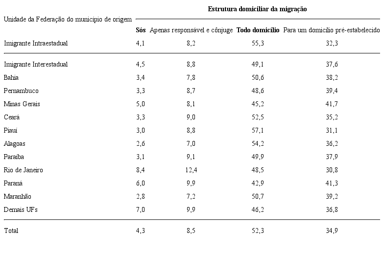 A desagregação dos dados por UF mostrou uma acentuada diferenciação entre esses indivíduos. Aqueles que procederam do Piauí e Alagoas, por exemplo, cujas rendas eram relativamente menores que os demais, tiveram percentuais maiores de indivíduos migrando com o domicílio todo ou para um domicílio preestabelecido. Por outro lado, aqueles que tiveram como origem o Rio de Janeiro, com níveis de renda mais elevado, apresentaram maiores percentuais de indivíduos que migraram sós.