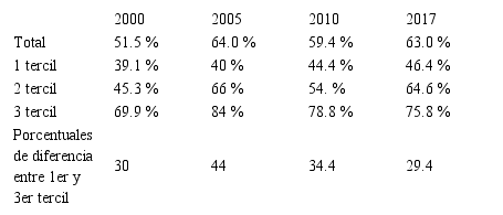 El sector social medio y medio bajo es el que más ha aumentado su presencia en la escuela media en el periodo 2000 a 2017 (19.3 %); lo sigue el tercil más bajo con el 7.3 % de crecimiento y los sectores medios y altos apenas han crecido un 5 % (ver cuadro 3 del anexo).