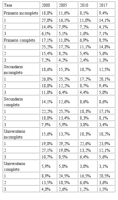 Un análisis de la situación laboral que articula tercil de ingreso, con titulación y tasa de empleo (cuadro 6 del anexo) reafirma algunos de los supuestos que alimentan el discurso público y rebate algunos otros. Es cierto que poseer un título universitario perteneciendo al tercil más bajo de la población protege más de la desocupación que si solo se tiene la primaria incompleta, pero la diferencia entre un extremo y otro es de solo 6.4 puntos en el 2017. En cambio, si miramos los datos del 2010, la diferencia es de 5.5 puntos. Sin embargo, en el 2000 esta diferencia era de 18 puntos, en el 2005 de 8 y en el 2010 de 5.5. En definitiva, la comparación nos muestra que el margen de protección que da el título universitario a los jóvenes pobres ha ido disminuyendo en el periodo, posiblemente como consecuencia de un aumento de las titulaciones, pero cabe también preguntarse por cambios en el propio mercado de trabajo.[1]