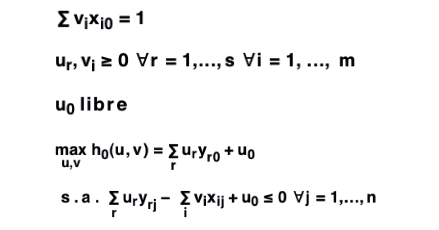 El modelo a utilizar en este artículo es la variante que Banker, Charnes y Cooper (1984) hacen del modelo original de ratios. En este, se define la eficiencia de la unidad dependiente de una ponderación de la producción del output ; y de una ponderación de la utilización del recurso . La suma corresponde a la producción total de resultados y a la utilización total de recursos. Se define entonces la Ecuación 1, que añade un término de ineficiencia ( que es calculado al resolver la ecuación.